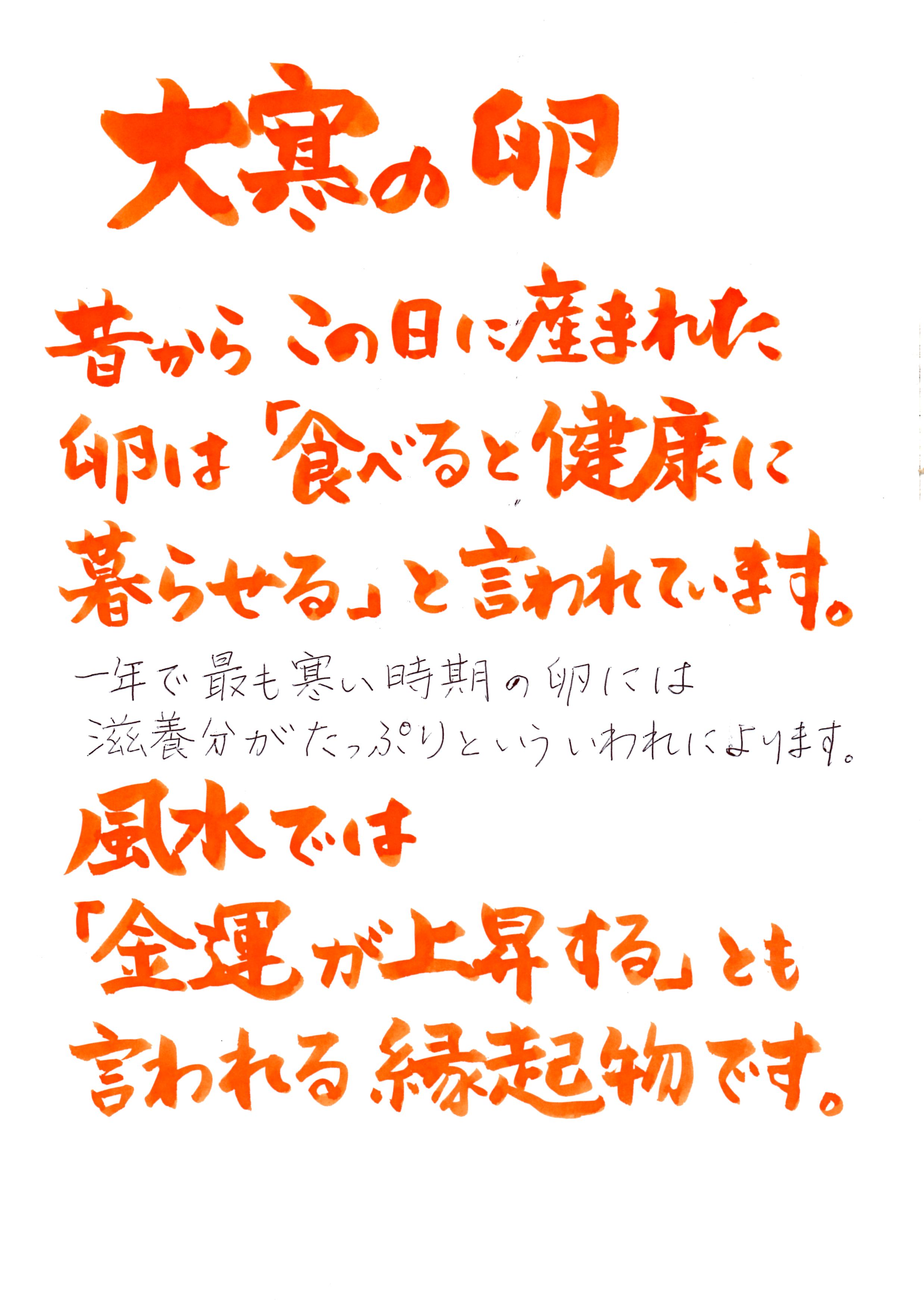 1年で一番寒いと言われるこの日、卵を食べると一年元気に過ごしていけるという、縁起の良い言い伝えがあります。